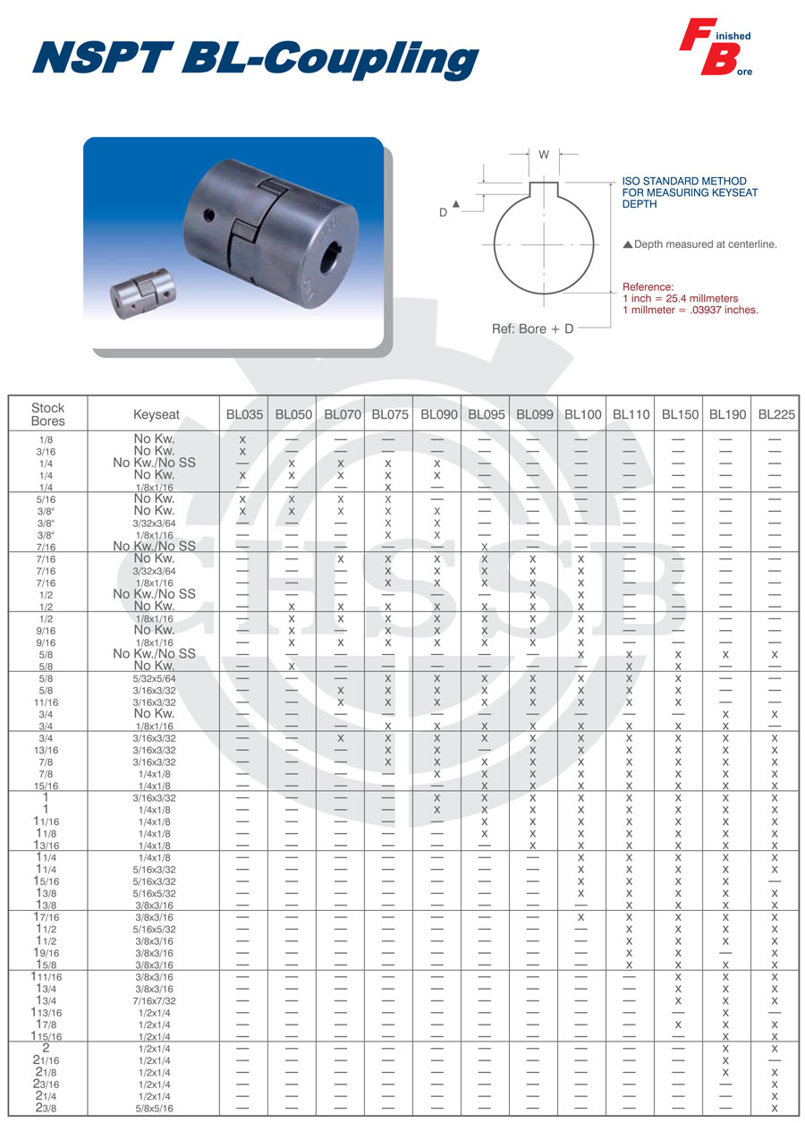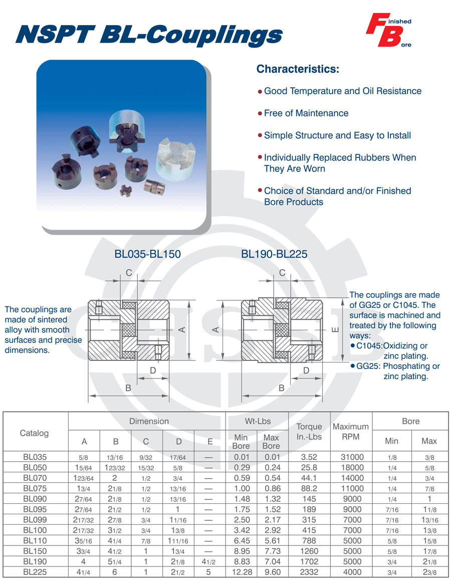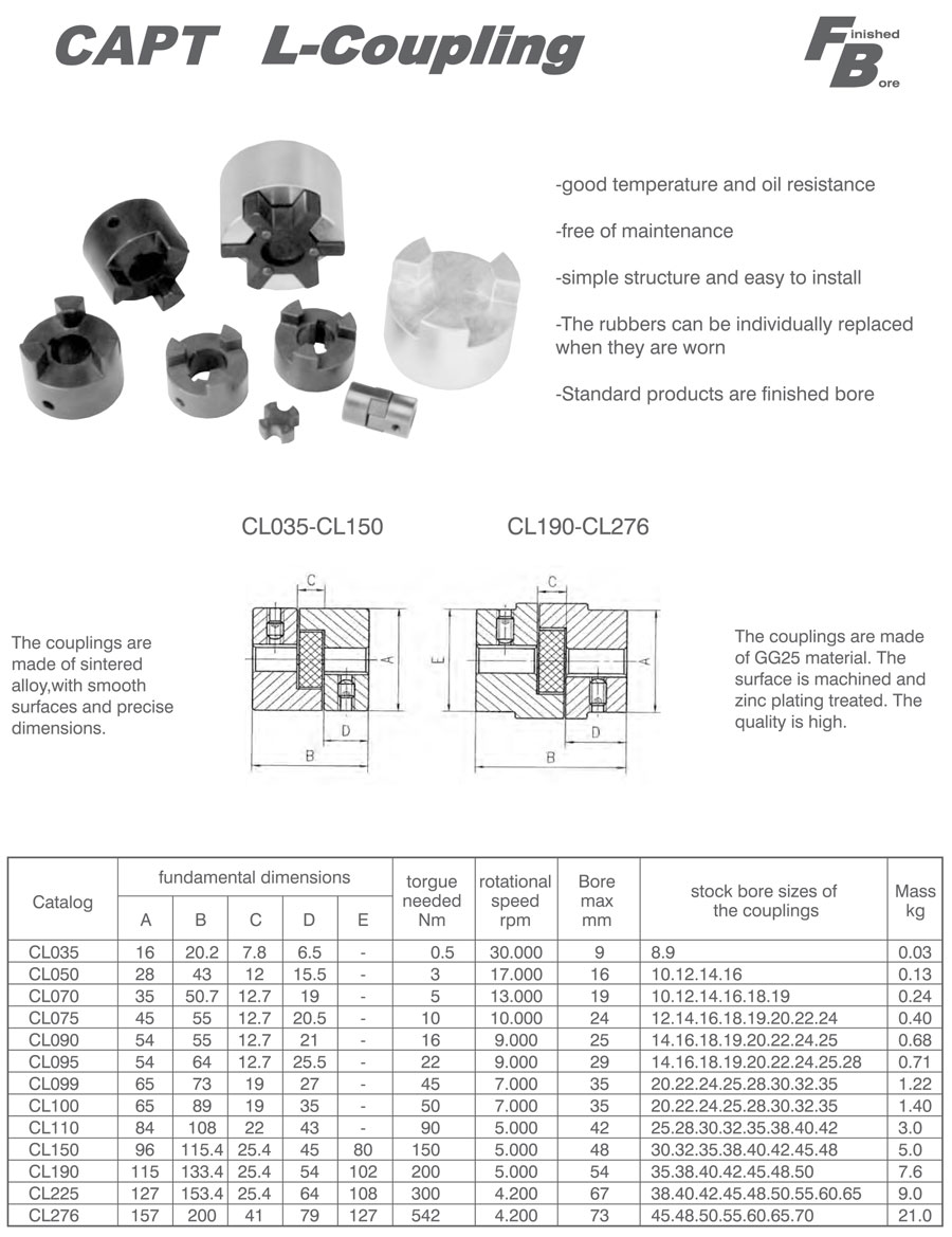 產品范圍: 美標:(FB-BL) 歐標:(CL) 英制尺寸產品(適用于美標市場) 公制尺寸產品(適用于歐標市場) FB型聯軸器 BL型聯軸器 CL型聯軸器